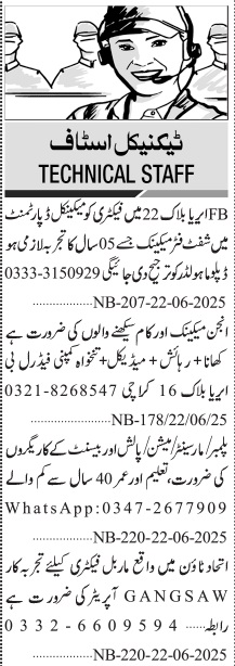 Jang Sunday Classified Ads 22 June 2025 For Technical Staff