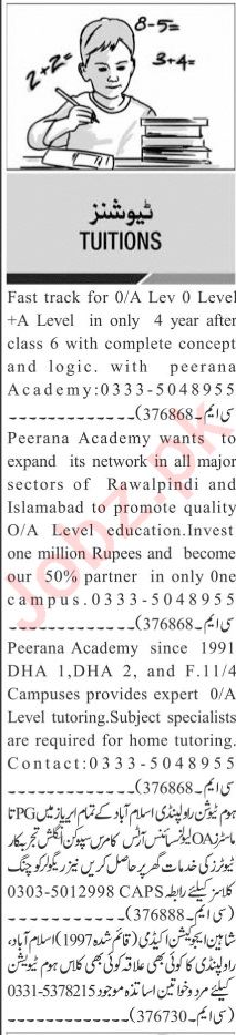 Academy Islamabad, rawalpindi Islamabad Pakistan invites applications from eligible candidates for the post of home tutor, o level teacher, teacher and a level teacher as per advertisement of October 23, 2023 published in daily Jang Newspaper. Educational qualifications required MA, Bachelor, Master and M.sc etc.