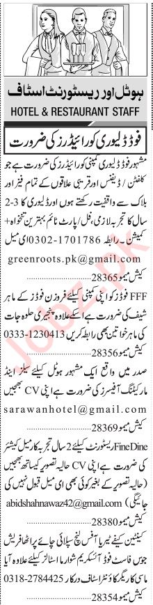 Restaurant Karachi, karachi Sindh Pakistan invites applications from eligible candidates for the post of marketing officer, aya, delivery rider, juice maker, sales officer, chef, masi, rider, cashier, fast food cook and counter staff as per advertisement of October 23, 2023 published in daily Jang Newspaper. Persons with Intermediate, Middle and Matric etc. education can apply.