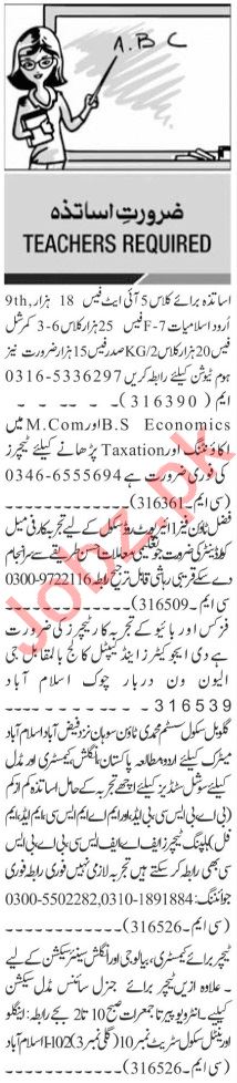 Teacher, Maths Teacher, Urdu Teacher, Art Teacher, ESL Teacher, High School Teacher, History Teacher, Kindergarten Teacher, Middle School Teacher, Montessori Teacher, Music Teacher, PT Teacher, Preschool Teacher, School Administrator, School Counselor, School Librarian, School Secretary, Science Teacher seeks in well progressive schools.