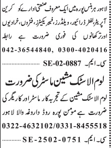 Factory jobs advertisement dated about 24 February 2025 in daily Jang Newspaper invites application for the vacant post of welder, crane operator, lathe machine operator, fabricator, lifter driver, fitter, carpenter and loom elastic machine master in Daroghawala Lahore, lahore Punjab Pakistan. Persons with Bachelor, DAE, Matric and Intermediate etc. education can apply.