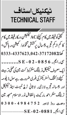 Factory Wahdat Road Lahore, lahore Punjab Pakistan invites applications from eligible candidates for the post of ducting instructor, field worker, civil diploma holder and ac technician as per advertisement of February 24, 2025 published in daily Jang Newspaper. Persons with Intermediate, Matric and DAE etc. education can apply.