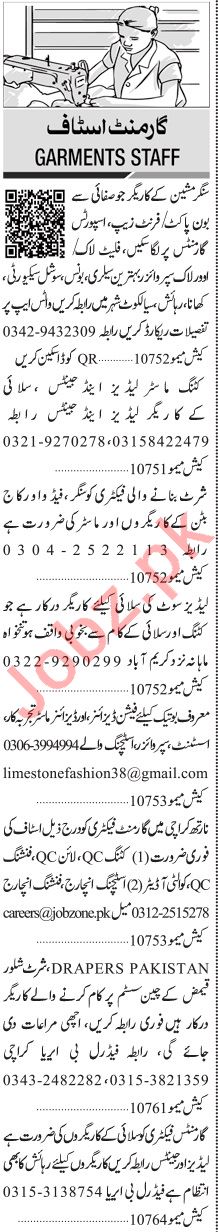 Jang Sunday Classified Ads 23 May 2021 for Garments Staff