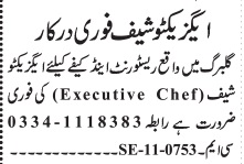 Restaurant jobs advertisement dated about 24 November 2025 in daily Jang Newspaper invites application for the vacant post of executive chef, cook and chef in Gulberg Lahore, lahore Punjab Pakistan. Matric and Intermediate etc. educational qualification will be preferred.