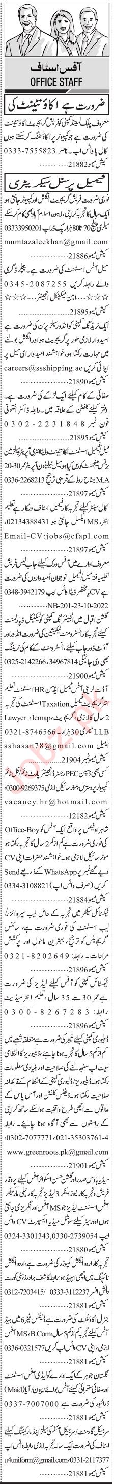 Private Company Karachi, karachi Sindh Pakistan invites applications from eligible candidates for the post of taxation assistant, office boy, personal secretary, admin assistant, accountant, composer, engineer, general accountant, salesman, data entry operator, lab assistant, sales person, office assistant, hr assistant, call center agent, manager, assistant accountant, lab supervisor, telemarketer, telephone operator, instrument technician, sweeper and social media expert as per advertisement of October 24, 2022 published in daily Jang Newspaper. Persons with Matric, Intermediate, Middle and Bachelor etc. education can apply.