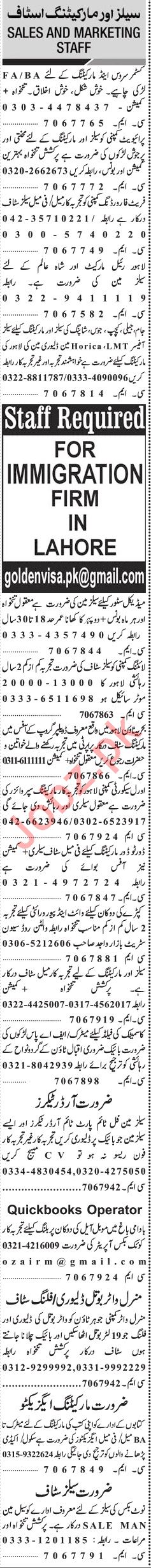 Jang Sunday Classified Ads 23rd June 2019 for Sales Staff