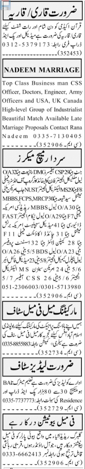 Vacant posts including sales officer, marketing staff, qaria, lady office staff, marketing officer, sales staff, quran teacher, qari and beautician are announced in Private Company Islamabad, rawalpindi Islamabad Pakistan as per 25 April 2022 advertisement in daily Jang Newspaper. Persons with Intermediate, Matric, Middle and Bachelor etc. education can apply.