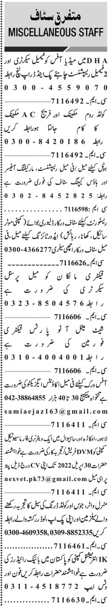 Vacant posts including marketing officer, bike rider, accounts executive, ac mechanic, cold room mechanic, female receptionist, mechanic, salesman, loader, factory foreman, female secretary, personal secretary, veterinary doctor, house keeping staff, delivery boy, receptionist, secretary and delivery rider are announced in Private Company Lahore, lahore Punjab Pakistan as per 25 April 2022 advertisement in daily Jang Newspaper. Candidates with Middle, Matric, Intermediate and Bachelor etc. educational background will be preferred.