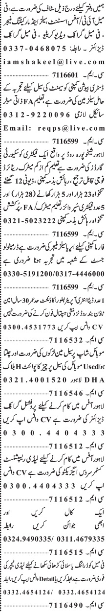Private Company jobs advertisement dated about 25 April 2022 in daily Jang Newspaper invites application for the vacant post of lady teacher, factory supervisor, receptionist, graphic designer, dermatologist, security guard, accountant, office assistant, salesman, sales manager, data entry operator, customer service executive, area sales manager, teacher, it officer, lady receptionist, marketing manager, fauji security guard and graphic video creative officer in Lahore, lahore Punjab Pakistan. Intermediate, Matric, Bachelor and Middle etc. educational qualification will be preferred.