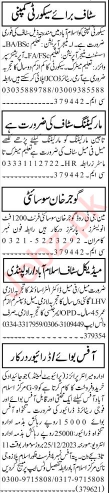 Vacant posts including female doctor, assistant manager operation, security guard, operation supervisor, marketing officer, lhv, dispenser, driver, office boy, manager operation, marketing staff and doctor are announced in Private Company Islamabad, islamabad Islamabad Pakistan as per 24 December 2023 advertisement in daily Jang Newspaper. Persons with Intermediate, MBBS, Bachelor, I.com, BA, DAE, Matric and Middle etc. education can apply.