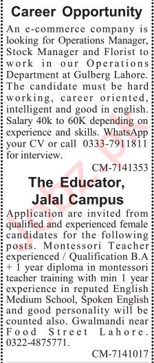 Private Company Lahore, lahore Punjab Pakistan invites applications from eligible candidates for the post of teacher, montessori teacher, stock manager, operations manager and florist as per advertisement of December 24, 2023 published in daily Jang Newspaper. Preferred Education is Matric, BA, Bachelor, Intermediate and MA etc.