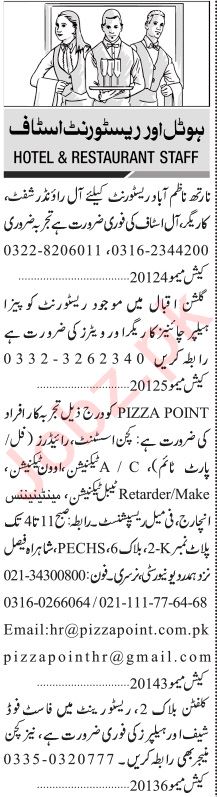 Hotel Karachi, karachi Sindh Pakistan invites applications from eligible candidates for the post of chef, incharge maintenance, rider, pizza chef, cook, ac technician, helper, chinese chef, table technician, fast food chef, kitchen assistant, receptionist, waiter, kitchen manager and oven technician as per advertisement of July 25, 2022 published in daily Jang Newspaper. Candidates with Intermediate, Bachelor, Middle and Matric etc. educational background will be preferred.