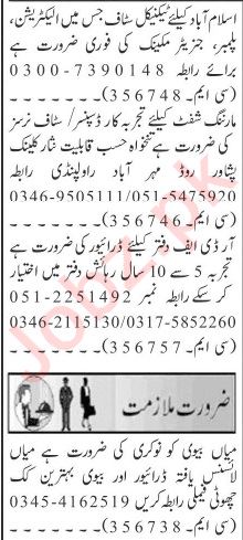 Private Company Islamabad, islamabad Islamabad Pakistan invites applications from eligible candidates for the post of generator mechanic, plumber, driver, ltv driver, nurse, electrician, staff nurse and dispenser as per advertisement of July 25, 2022 published in daily Jang Newspaper. Educational qualifications required Intermediate, Matric, Middle and Bachelor etc.