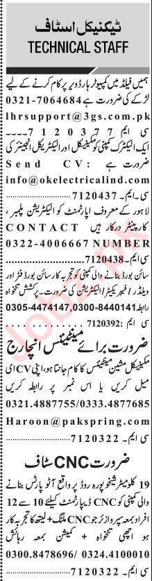 Manufacturing Company jobs advertisement dated about 25 July 2022 in daily Jang Newspaper invites application for the vacant post of technician, maintenance incharge, cnc machine operator, supervisor, engineer, fabricator, electrical engineer, electrician, welder, plumber, sign board fitter, cnc milling operator, computer hardware technician, mechanical engineer and carpenter in Lahore, lahore Punjab Pakistan. Persons with Bachelor, Matric and Intermediate etc. education can apply.