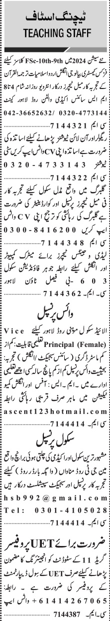 Private School invites applications for job positions advertised in daily Jang dated 25 March 2024 for following vacancies in Lahore, lahore Punjab Pakistan.