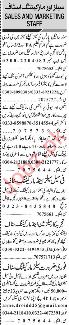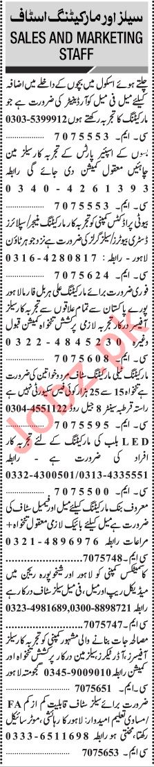 Jang Sunday Classified Ads 24 Nov 2019 For Marketing Staff