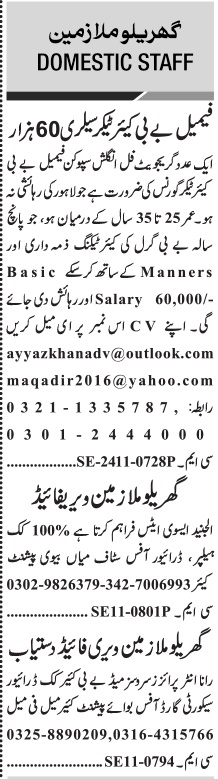 Jang Sunday Classified Ads 24 Nov 2024 For Domestic Staff