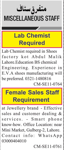 Private Company jobs advertisement dated about 25 November 2024 in daily Jang Newspaper invites application for the vacant post of lab chemist, sales staff, customer dealing expert and chemist in Lahore, lahore Punjab Pakistan. Preferred Education is BA, Intermediate, Bachelor and Matric etc.