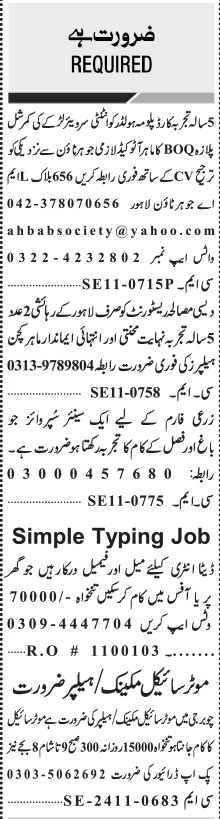 Private Company invites applications for job positions advertised in daily Jang dated 25 November 2024 for following vacancies in Lahore, lahore Punjab Pakistan.