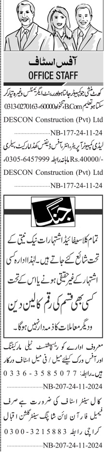 Jang Sunday Classified Ads 24 Nov 2024 For Office Staff