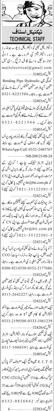 Factory Karachi, karachi Sindh Pakistan invites applications from eligible candidates for the post of diesel engine mechanic, ac technician, solar technician, co welder, cnc operator, plumber, turner, carpenter, power press operator, machine maintenance technician, argon welder, power press expert, lathe machine operator, electrical diploma holder, pipe bender, helper, polish helper, generator technician, quality inspector, transport incharge, electrician, diesel generator mechanic and machine operator as per advertisement of August 26, 2024 published in daily Jang Newspaper. Candidates with Intermediate, Matric, Middle, DAE, Bachelor and BA etc. educational background will be preferred.
