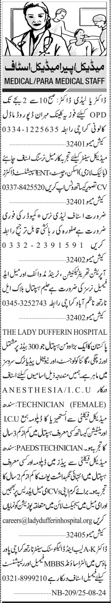 Jang Sunday Classified Ads 25 Aug 2024 For Medical Staff