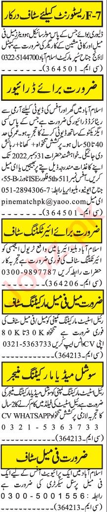 Private Company invites applications for job positions advertised in daily Jang dated 26 December 2022 for following vacancies in Islamabad, rawalpindi Islamabad Pakistan.