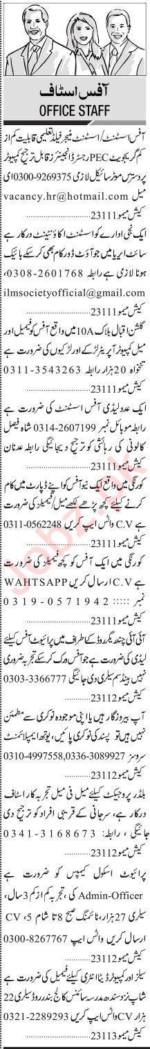 Jang Sunday Classified Ads 25 Dec 2022 For Office Staff