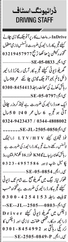 Jang Sunday Classified Ads 25 May 2025 for Driving Staff
