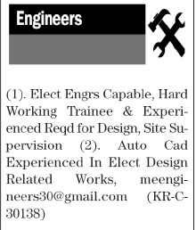 Engineering Company jobs advertisement dated about 26 May 2025 in daily Jang Newspaper invites application for the vacant post of autocad operator, site supervisor, engineer and electrical engineer in Karachi, karachi Sindh Pakistan. Preferred Education is Bachelor, Intermediate and DAE etc.