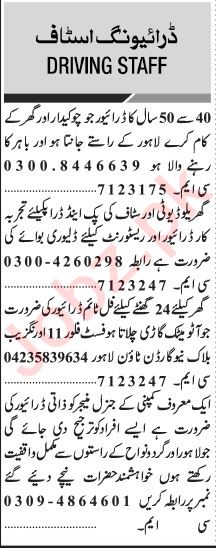 Private Company jobs advertisement dated about 26 September 2022 in daily Jang Newspaper invites application for the vacant post of car driver, ltv driver, delivery boy, chowkidar and driver in Lahore, lahore Punjab Pakistan. Educational qualifications required Middle, Primary and Matric etc.