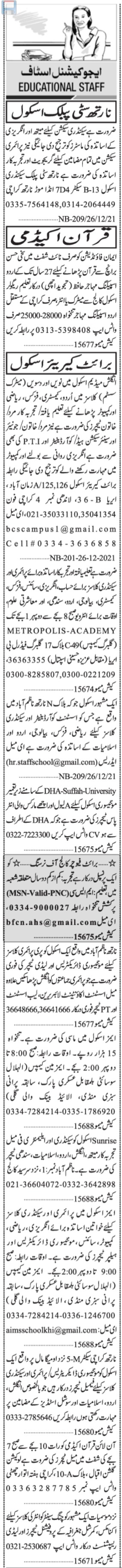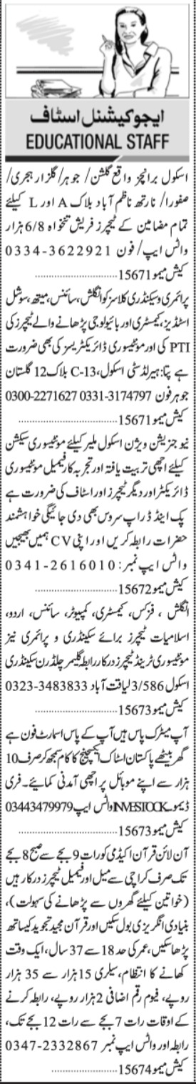 Principal, Vice Principal, Teacher, English Teacher, Chemistry Teacher, Physics Teacher, Coordinator, Biology Teacher, Maths Teacher, Urdu Teacher, Montessori Teacher, Section Head, Teaching Assistant, Nursery Teacher, Special Education Teacher seeks in well reputed schools.