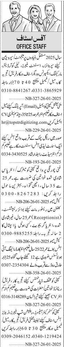 Jang Sunday Classified Ads 26 Jan 2025 for Office Staff