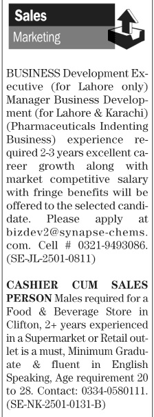 Jang Sunday Classified Ads 26 Jan 2025 for Sales Staff