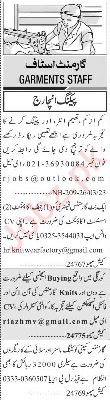 Jang Sunday Classified Ads 26 March 2023 for Garments Staff