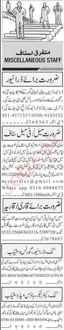 Vacant posts including cook, qari, admin manager, admin officer, accountant, care taker, maid, qaria, teacher, physiotherapist, ltv driver, telephone operator, husband wife, store keeper, nurse, house maid, governess, driver, kitchen helper, order booker, batman, quran teacher, sales officer, aya and patient care are announced in Private Company Islamabad, rawalpindi Islamabad Pakistan as per 27 March 2023 advertisement in daily Jang Newspaper. Persons with Intermediate, Bachelor, Middle and Matric etc. education can apply.