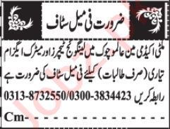 Academy Quetta, quetta Balochistan Pakistan invites applications from eligible candidates for the post of teacher and english language teacher as per advertisement of November 27, 2023 published in daily Jang Newspaper. Candidates with Master and Bachelor etc. educational background will be preferred.