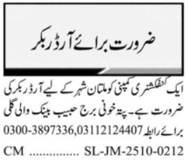 Confectionery Company is looking for candidates for following posts as per job advertisement published in daily Jang Newspaper of October 27, 2025 for location Multan, multan Punjab Pakistan:
