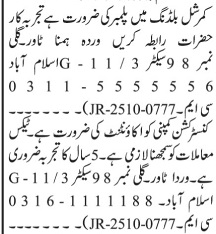 Construction Company G-11/3 Islamabad, islamabad Islamabad Pakistan invites applications from eligible candidates for the post of accountant and plumber as per advertisement of October 27, 2025 published in daily Jang Newspaper. Educational qualifications required Matric, Middle, Bachelor and B.com etc.