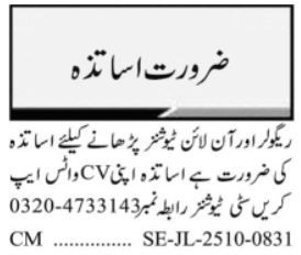Jang Sunday Classified Ads 26 Oct 2025 For Teaching Staff