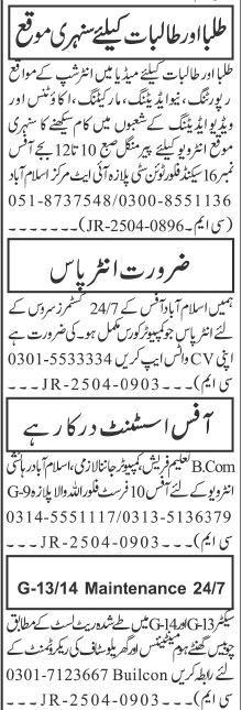Private Company is looking for candidates for following posts as per job advertisement published in daily Jang Newspaper of April 28, 2025 for location G-13 Islamabad, islamabad Islamabad Pakistan: