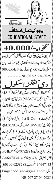 Jang Sunday Classified Ads 27 April 2025 For Kings School