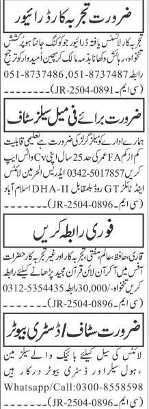 Private Company GT Road Islamabad, rawalpindi Islamabad Pakistan invites applications from eligible candidates for the post of driver, qari, sales staff, distributor, cook, ltv driver, salesman, hafiz, sales girl and quran teacher as per advertisement of April 28, 2025 published in daily Jang Newspaper. Candidates with Primary, Matric, Middle and Intermediate etc. educational background will be preferred.