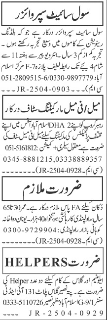Private Company G-9/1 Islamabad, rawalpindi Islamabad Pakistan invites applications from eligible candidates for the post of marketing staff, civil site supervisor, marketing officer, helper and shop helper as per advertisement of April 28, 2025 published in daily Jang Newspaper. Persons with Bachelor, DAE, Matric, Middle, BA and Intermediate etc. education can apply.