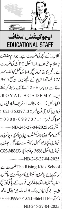 Jang Sunday Classified Ads 27 April 2025 for Teaching Staff