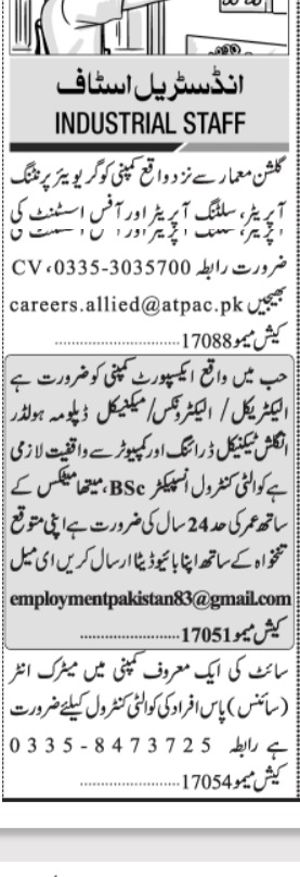 Jang Sunday Classified Ads 27 Feb 2022 For Industrial Staff