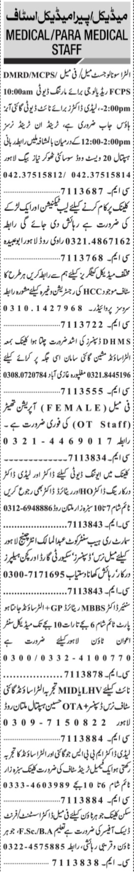Hospital Clinic invites applications for job positions advertised in daily Jang dated 27 February 2022 for following vacancies in Lahore, lahore Punjab Pakistan.