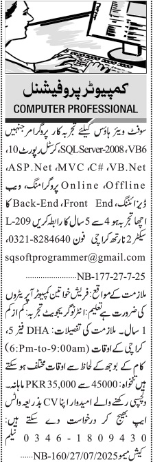 Jang Sunday Classified Ads 27 July 2025 for Computer Staff