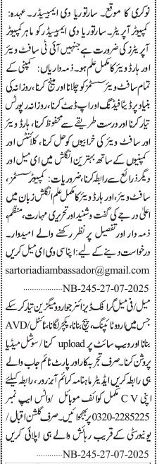 IT Company Gulshan-e-Iqbal Karachi, karachi Sindh Pakistan invites applications from eligible candidates for the post of typist, it expert, graphic designer and computer operator as per advertisement of July 28, 2025 published in daily Jang Newspaper. Candidates with Intermediate, Others, Bachelor, BCS and BA etc. educational background will be preferred.
