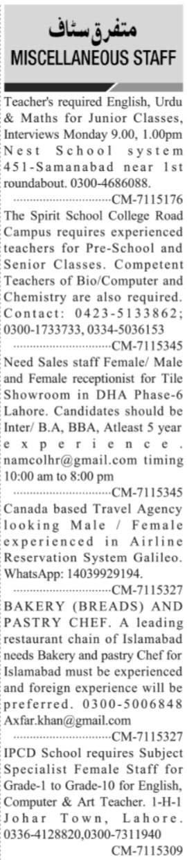Vacant posts including chef, receptionist, english teacher, art teacher, urdu teacher, female receptionist, biology teacher, maths teacher, travel agent, chemistry teacher, preschool teacher, teacher, subject specialist, pastry chef and computer teacher are announced in Private Company Lahore, lahore Punjab Pakistan as per 28 March 2022 advertisement in daily Jang Newspaper. Educational qualifications required Master, Middle, Matric, Intermediate and Bachelor etc.
